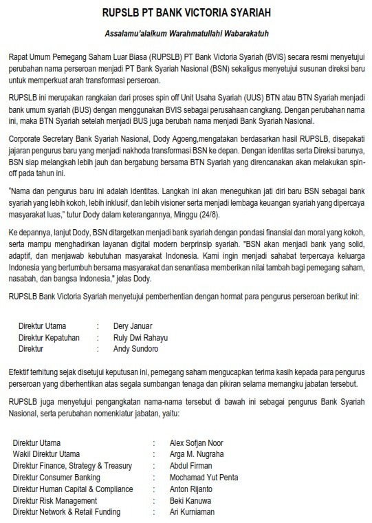 RUPSLB PT Bank Victoria Syariah Resmi Menjadi PT Bank Syariah Nasional